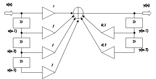 y ( n )= x ( n )+ x ( n -1)+ x ( n -2)+ x ( n -3)+0,5* y ( n -1)+0,3* y ( n -2)