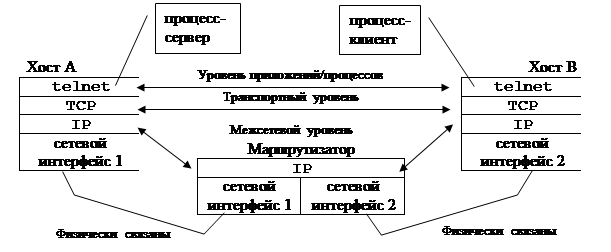 Рассмотрим работу семейства протоколов TCP/IP при обмене данными между двумя процессами telnet, выполняющимися на двух разных хостах, входящих в две разные сети, соединенные посредством маршрутизатора.