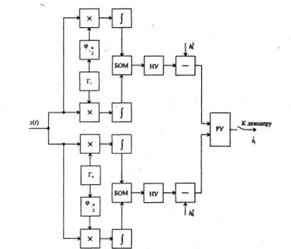выделяется закон изменения информационного параметра, который в нашем случае пропорционален сигналу ИКМ. Для регистрации переданных двоичных символов к выходу фазового демодулятора подключено решающее устройство (РУ). В условиях действия помех в НКС РУ принимает решения неоднозначно, что в свою очередь может привести к двум возможным ошибкам (при передаче двоичных сигналов