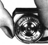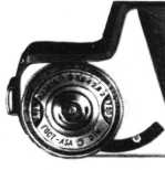 | На шкале чувствительности пленки нанесены цифры 16, 32, 65, 130, 250, 500, указывающие чувствительность пленки в ед. ГОСТ-ASA, причем под цифрой 32 нанесены две точки: левая точка соответствует пленке чувствительностью 25 ед. ГОСТ-ASA, правая -- 32 ед. ГОСТ-ASA. На противоположной стороне шкалы нанесены цифры 13, 16, 19, 22, 25, 28, указывающие чувствительность пленки в градусах DIN. Цифры шкалы чувствительности пленки видны в радиальных окнах шкалы диафрагм, имеющих установочный индекс. Чтобы установить чувствительность пленки (например, 65 ед. ГОСТ-ASA), необходимо повернуть шкалу диафрагм до совпадения установочного индекса с делением 65. Таким же образом производится установка чувствительности, если пленка имеет обозначение в градусах DIN. |