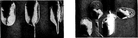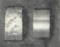 На рисунке 1.2 показано влияние окислов и газовых включений на припой. В обычном прутке на поверхности видно сравнительно большое количество окисных включений и обесцвеченных пятен; на поверхности отмечаются также сильная пористость и газовые карманы. Образец припоя вакулой (припой переплавленный в вакууме для удаления газовых включений) имеет блестящую поверхность, газовые карманы отсутствуют.