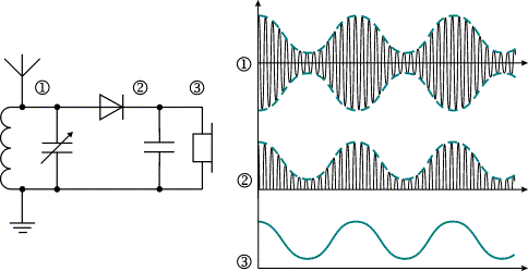 Из принятых антенной ВЧ сигналов выделяется тот, в резонанс с которым настроен колебательный контур. Форма сигнала в точке (1) представляет собой высокочастотный сигнал, модулированный по амплитуде. Задача детектора состоит в том, чтобы «вырезать» положительную полуволну (2), которая также содержит полезную информацию в виде изменения амплитуды – так называемую огибающую (на рисунке показана пунктирной линией). Но высокочастотный сигнал нельзя прослушать на наушники – нужна звуковая частота. Для удаления ВЧ составляющей в схему после диода включен конденсатор. Емкость конденсатора выбрана таким образом, чтобы он пропускал только высокочастотную составляющую. Теперь мы имеем сигнал (3), эквивалентный переданному радиопередатчиком.