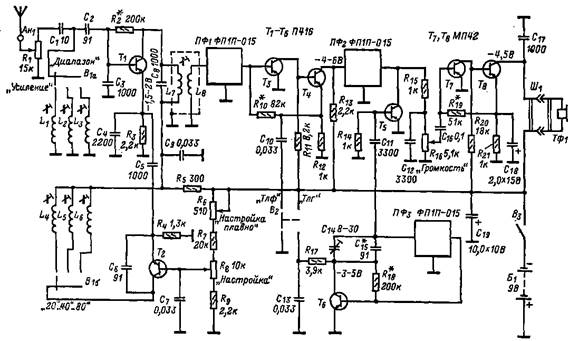 Переключатель диапазонов В1 — галетный на три положения; переключатель режимов работы В2 и выключатель питания В3 — тумблеры ТВ2-1. Головные телефоны высокоомные.