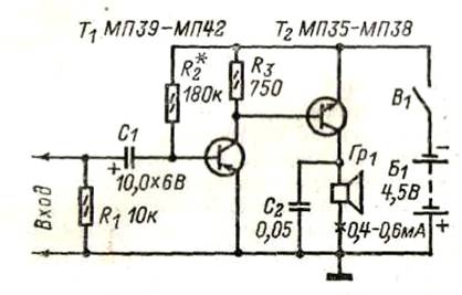 2) Вместо головных телефонов поставить двухкаскадный усилитель на транзисторах разной структуры (схема на рис. 8). Этот усилитель прост в изготовлении и обеспечивает хорошее усиление, достаточное для громкого воспроизведения.