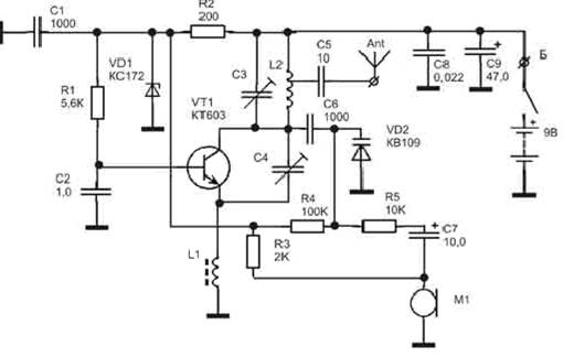 Генератор передатчика собран по схеме емкостной трехточки. Частотная модуляция осуществляется изменением емкости варикапа VD2 за счет подаваемого напряжения с микрофона. Изменение напряжения на микрофоне, за счет воздействия звука, достаточно для получения требуемой девиации частоты без применения дополнительного микрофонного усилителя. За счет параметрического стабилизатора напряжения, собранного на R2 и VD1, обеспечивается стабильная работа генератора передатчика и стабильная частота от изменения напряжения питания. Конденсатор С4 керамические подстроечные емкостью 4/20 пФ. Конденсатор С3 переменный. Катушка L2 бескаркасная наматывается на оправке диаметром 4мм проводом ПЭВ2-0,31 6 витков с отводом от 2-го считая от верхнего по схеме конца. Дроссель L1 50мкГн (60 витков на сердечнике 400Н, 600Н диаметром 2,8 мм и длиной 12...14 мм). Транзистор КТ603 можно заменить на КТ646. Настройка передатчика производится на свободный участок диапазона УКВ 88-108 МГц конденсатором С3 и сдвигая/раздвигая витки катушки L2.