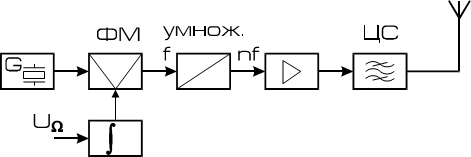 Для косвенного получения частотной модуляции используются фазовые модуляторы в начальных каскадах с последующим умножением частоты и усилением мощности сигнала ФМК.