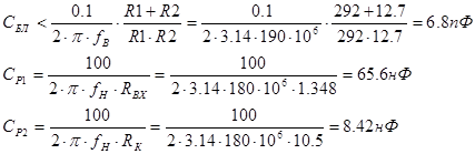 Поскольку расчётные значения номиналов получаются очень разные, то требуется подбор наиболее подходящего номинала из стандартных значений. Прежде всего при подборе элемента стандартного номинала нужно учитывать мгновенные амплитудные значения токов и напряжений, протекающих через элементы, мощность, проходящую через элементы, рассеиваемую мощность на элементах, электромагнитную совместимость и диапазон рабочих частот. Отметим также, что поскольку выходной фильтр должен иметь значения номиналов входящих в него элементов в соответствии расчётными, то точность подбора каждой ёмкости обеспечивается посредством параллельного включения двух конденсаторов, один из которых выбирается чуть меньше рассчитанного номинала, а другой подстроечный – для точной настройки. Для нашего усилительного каскада номиналы элементов получились следующими: