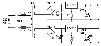 Стабилизатор напряжения выполним на микросхеме LM350 фирмы Motorola, которая обеспечивает выходное напряжение