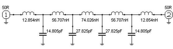 Для расчета фильтра также использовалась программа Rfsim99. Для частотного анализа фильтра использовали программу PSpice, потому что анализ, предложенный разработчиками Rfsim99 неудобен для представления. Задали неравномерность в полосе пропускания равной 0.1 дБ и затухание на 360 МГц 40 дБ. Зная, что только фильтры с нечетным порядком не трансформируют сопротивление, методом подбора выбрали порядок фильтра, он оказался девятым: