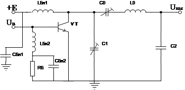Из сказанного выше, не обременяя себя лишними проблемами, выберем в качестве усилителя мощности генератор с внешним возбуждением по однотактной схеме построения. Активный же элемент, используемый в качестве усилительного, включим по схеме с общим эмиттером (ОЭ). Принципиальная схема усилителя мощности, выбранная в нашем случае, представлена на рисунке 3.1.