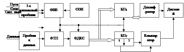 Полученный стробирующий импульс (временные ворота) и тактовые импульсы подаются в формирователь тест-последовательности, в который через пробник данных также поступает последовательность данных из исследуемого устройства.