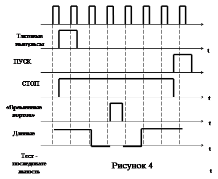 Первая операция протекает следующим образом. Из исследуемого устройства через пробник в анализатор поступают сигналы трех видов: тактовые импульсы, сигналы запуска ПУСК и сигналы останова СТОП. Фронт сигнала ПУСК подготавливает регистр сдвига формирователя сигнатур к приему тест-последовательности и задает фронт временных ворот, а фронт сигнала СТОП – их срез. Таким образом интервал времени, разделяющий фронты сигналов ПУСК и СТОП определяет длительность временных ворот как показано на рисунке 4.