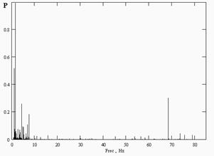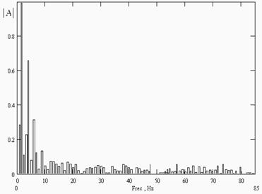 Амплітудний спектр сигналу, розрахований методом Проні, наведений на рис. 3. Видно, що основним недоліком детермінованої моделі є обмежений порядок, пов'язаний з тим, що факторизація характеристичного полінома здійснюється явно. Навіть при використанні удосконалених алгоритмів факторизації максимально досяжний порядок не перевищує 256, що ускладнює виділення спектральних піків для зашумленої вибірки, якою є електроенцефалограма. Таким чином, оптимальними методами спектрального оцінювання в клінічній електроенцефалографії слід вважати статистичні алгоритми на основі АР-моделі.