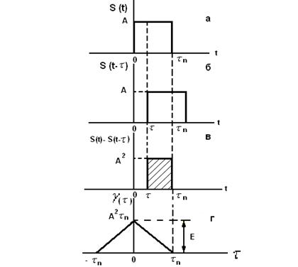 Рис. 4 пояснює побудову функції автокореляції прямокутного імпульсу, що зображений на рис. 4а. На рис. 4б наведена зміщена на