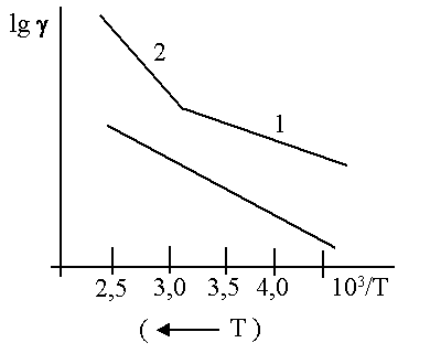 В координатах lnγ = f(1/T ) эта зависимость представляется в виде прямой линии, либо в виде линии с изломом, если имеются два различных механизма проводимости (рис. 2.2). В этом случае зависимость γ от 1/T будет представляться суммой двух экспонент