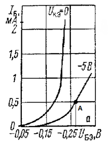 Рис. 1.2 Сімейство вхідних характеристик транзистора МП39 схеми з ЗЕ (А - обрана робоча точка).