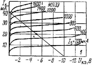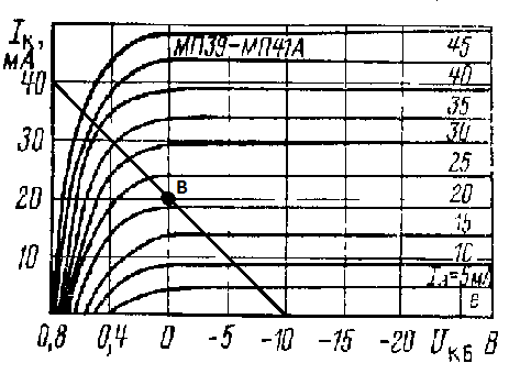 Рис. 1.3 Сімейство вихідних характеристик транзистора МП39 схеми з ЗБ (В- обрана робоча точка).