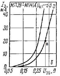 Рис. 1.2 Сімейство вхідних характеристик транзистора МП39 схеми з ЗБ (В - обрана робоча точка).