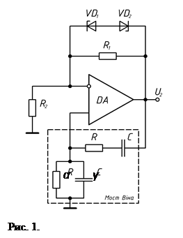 Генератор з мостом Віна. В схемі (рис. 1) RC–генератора використовується частотно–залежний позитивний зворотній зв'язок (міст Віна) і частотно–незалежний негативний зворотній зв'язок (НЗЗ) за допомогою резисторів