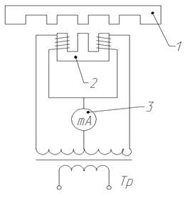 На подвижной части станка устанавливается тонкая рейка из магнитомягкого материала. Выступы рейки 1 модулируют магнитное сопротивление рабочего зазора при движении. Магнитопровод Ш-образного сердечника 2 имеет две обмотки, включенные навстречу друг другу и питаемые от трансформатора Тр. В диагональ индуктивного моста включен измерительный прибор. В среднем положении измерительный мост сбалансирован и стрелка прибора 3 будет стоят на нуле. Незначительный разбаланс приводит к отклонению стрелки прибора. Хорошо выполненный датчик улавливает перемещения ~2 мкм. Для дискретных схем необходим цифроаналоговый преобразователь (ЦАП).