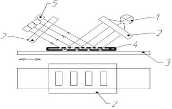1 – источник света, 2 – конденсорные линзы, 3 – стальная шкала с решеткой, 4 - диафрагма, 5 – фотоприемник.