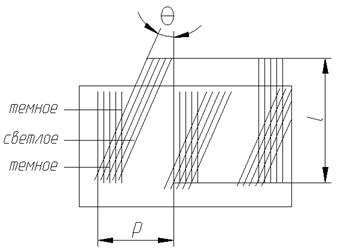 При смещении решеток друг относительно друга зоны (темные и светлые) смещаются друг относительно друга вверх-вниз на расстояние l. Р – шаг решетки, θ – угол наклона.