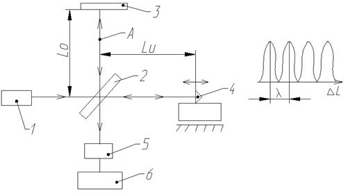 1 – лазер, 2 – полупрозрачное зеркало, 3 – неподвижное отражающее зеркало, 4 - отражатель, установленный на перемещающейся детали, 5 – фотоприемник, 6 – электронное устройство обработки данных.