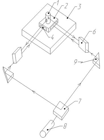 1 – рабочая головка (тубус); 2, 3 – каретки; 4 – зеркала; 6 – измерительные головки; 7 – разделитель; 8 - лазер; 9 – призма.