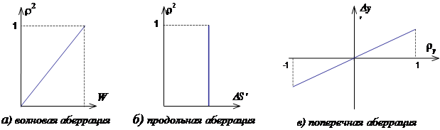 При анализе аберраций оптических систем принято строить графики зависимости поперечной, продольной, и волновой аберраций от зрачковых координат. Если в оптической системе присутствует только дефокусировка, то эти графики будут выглядеть как показано на рисунке 2.