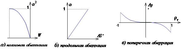 В простых положительных линзах сферическая аберрация 3 порядка отрицательна, а в отрицательных положительна. Графики волновой, продольной и поперечной аберраций в случае сферической аберрации 3 порядка представлены на рис.4.