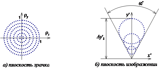 Для того чтобы лучше понять структуру поперечных аберраций при коме, рассмотрим точечную диаграмму лучей. Разобьем зрачок на множество равновеликих площадок и рассмотрим лучи, проходящие через центры этих площадок (рис.9.а). Получим картину лучей, равномерно распределенных по зрачку. Точки пересечения этих лучей с плоскостью изображения образуют точечную диаграмму (рис.9.б).