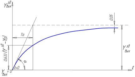 Для определения Та проводят касательную к кривой разгона из точки t=0. Касательная отсекает отрезок на оси времени, при пересечении касательной и заданного значения регулируемой величины, определяемого величиной воздействия. Практика получения и обработки разгонных характеристик показывает, что для одноемкостных ОР с самовыравниванием время разгона Та соответствует времени, прошедшему от момента возникновения возмущения до момента достижения регулируемой величины значения, равного 0,633 потенциального значения