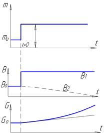 Неустойчивые объекты или объекты с отрицательным самовыравниванием. К числу неустойчивых относят ОР, у которых, даже при самом незначительном возмущении, отклонение параметра продолжается безгранично и со все возрастающей скоростью. Примером регулируемого объекта, имеющего в некоторых режимах отрицательное самовыравнивание, может служить шаровая барабанная мельница (ШБМ) как ОР загрузки барабана мельницы топливом. Разгонная характеристика ШБМ изображена на рис. 4 при ступенчатом изменении положения регулировочного органа подачи топлива m. При загрузках ниже нормальной мельница имеет положительное самовыравнивание, т.е. является устойчивым объектом. При номинальной нагрузке самовыравнивание мельницы равно нулю и она представляет собой в этом режиме астатический объект. Наконец, перегруженная мельница становится неустойчивым объектом вследствии того, что производительность мельницы (выдача пыли В2 ) падает с ростом загрузки ее топливом (G). Если в режиме, когда ШБМ находится на границе устойчивости, нарушить равновесное состояние мельницы за счет увеличения подачи топлива В1 , то наступающий при этом рост загрузки обуславливает в свою очередь уменьшение выдачи пыли В2 .