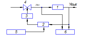 Рис. 10 - Схема получения частотных характеристик: 1- объект регулирования, 2- регулятор, 3- исполнительный механизм, 4- регулировочный орган, 5- генератор колебаний, 6- регистратор.