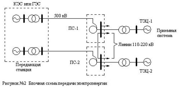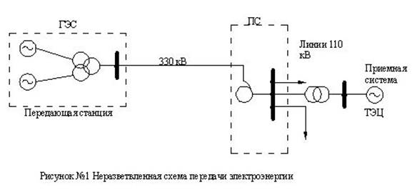 Передача мощности от удаленных электростанций на первых этапах развития межсистемных межсистемной связи выполняются в виде неразветвленной электропередачи напряжением (330) 5001150 кВ (рисунок №1). Мощные КЭС или ГЭС имеют блочную схему. К каждому трансформатору присоединяют от одного до трех генераторов, отдающих энергию на шины 500-150 кВ. Далее энергия передается по длинной линии, через понижающую подстанцию в приемную систему, часть нагрузки которой обеспечивается собственными генерирующими станциями (рис. №1)