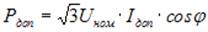 и допустимой мощностью по нагреву проводов линии с допустимым током Iдоп: