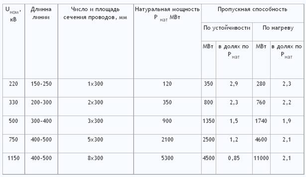 Характерные данные о пропускной способности линии электропередачи приведены в таблицу №2