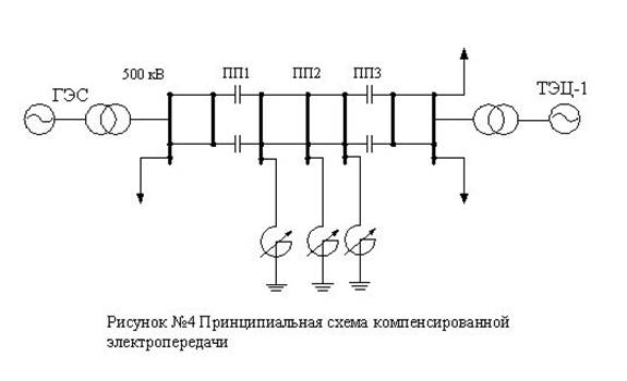 На рисунке №4 изображена упрощенная схема компенсированной ЛЭП 500 кВ повышенной пропускной способности.