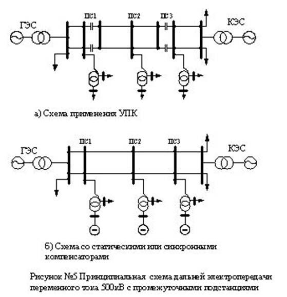 На рисунке №5 изображены упрощенные схемы электропередачи 500 кВ с включенными вдоль линии промежуточными подстанциями ПС1-ПС3. Для повышения устойчивости электропередачи в линию включают последовательно конденсаторы (УПК) (рисунок№5,а) или компенсаторы (синхронные или статические) на промежуточных подстанциях (рисунок №5, б)