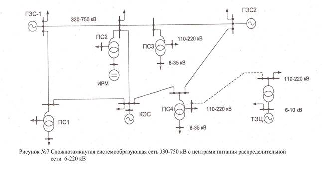 Рассмотренные схемы линий электропередачи (рисунок №1-№5) позволяют доставить электроэнергию потребителям от двух генерирующих источников и называются электропередачами с двусторонним питанием. По мере развития передающей сети в промежуточных пунктах магистральной сети наряду с понижающими подстанциями подключается отдельная электропередача, имеющая генерирующие источники, с оборотом или выдачей мощности (рисунок №6). В итоге формируется узловая система с тремя центрами питания и более высокой устойчивостью и пропускной способностью. В дальнейшем магистральные системообразующие сети, присоединены к двум-трем центрам питания, усложняются и преобразуются в замкнутые многоконтурные передающие сети с сосредоточенными нагрузками (рисунок №7). Замкнутые сети обеспечивают наибольшую надежность, поскольку авария (отключение) на каком-либо участке сети имеет последствия (например, ограничение потребляемой мощности) только для потребителей, непосредственно подключенных к этому участку.