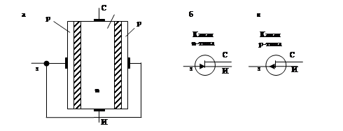 В зависимости от типа канала полевые транзисторы с управляющем p-n-переходом бывают (n ) типа и (p) типа. условно графические обозначения этих транзисторов приведены на рис 2.1 (б), (в).