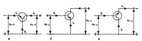 Биполярный транзистор является активным прибором, позволяющим осуществлять усиление электрических сигналов. В конкретных электронных схемах он включается как четырехполюсник, у которого имеются входная и выходная цепи. Один из электродов транзистора является общим. Возможны 3 схемы включения: схема с общей базой (ОБ), схема с общим эмиттером (ОЭ) и схема с общим коллектором (ОК) – показанные на рисунке 3.1 (а), (б), (в). Для обозначения напряжений, подаваемых на электроды транзистора используют двойные индексы. Первый индекс идентифицирует электрод, на который подаётся напряжение, измеряемое относительно общего электрода, обозначаемого вторым индексом. Например, U к-э-напряжение между коллектором и эмиттером, U к-б напряжение между коллектором и базой и т.д. На рисунке 3.1 показана полярность напряжений, соответствующая активному режиму работы транзистора и направления тока в этом режиме (для транзисторов типа p-n-p полярность напряжений и направления тока противоположны). Схема включения полевых транзисторов аналогична.