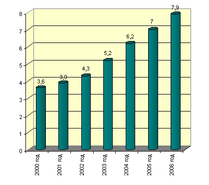 Диаграмма 1. Динамика объемов российского парфюмерно-косметического рынка в 2000 - 2006 гг., млрд. долл. *
