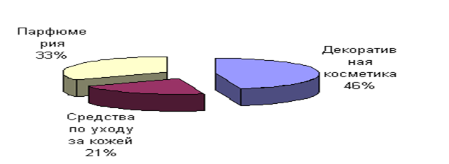 Согласно оценкам аналитиков, в 2006 году самая большая доля в объеме продаж косметики в России приходится на парфюмерию (20,1%). Следующими по величине сегментами являются средства для волос (19,71%) и гигиены полости рта (16,9%). Наибольшими темпами растут сегменты средств-депиляторов (до 28,6%). Стабильно высоким остается прирост в парфюмерии (29,6%) и средств ухода за телом (20%). Также наблюдается увеличение интенсивности потребления некоторых категорий косметики (солнцезащитная косметика, уход за кожей тела, средства для укладки волос и др.) и происходит активное освоение новых сегментов отрасли (мужской, антивозрастной, детской косметики).
