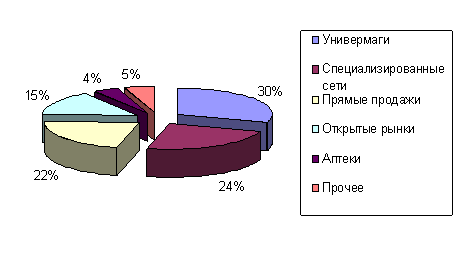 По данным ЭМГ «Старая крепость», наибольшую долю по числу продаж парфюмерно-косметической продукции занимают универмаги и специализированные магазины (30% и 24% соответственно, диаграмма 3). Эти дистрибуторы активно ведут борьбу за покупателя, используя рекламу и PR, а также программы привлечения и удержания клиентов.