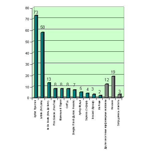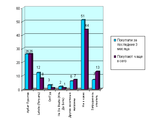 Так, «Арбат престиж» знают 73% москвичей, «ЛЭтуаль» - 58%, ILE DE BEAUTE – 13%. Доли остальных сетевых участников рынка составляют не более 10%. Чаще всего москвичи совершают покупки в «Арбат престиж» - 26% респонднтов, «ЛЭтуаль» - 8%, ILE DE BEAUTE и «Ол!Гуд» – по1% (диаграмма 6). На несетевые магазины приходится около 7%.