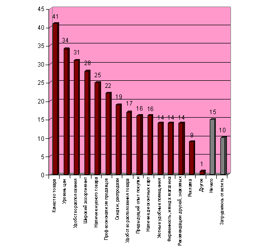 Кроме этого, важными критериями являются: широкий ассортимент товаров (28%), наличие товара, который устраивает потребителя (25%), профессионализм продавцов (22%), а также скидки, распродажи, удобство расположения товара на полках, предыдущий опыт покупки, наличие дисконтных карт, уютные, удобные помещения, «фирменность»/ имидж магазина, рекомендации друзей/знакомых.