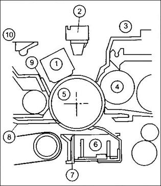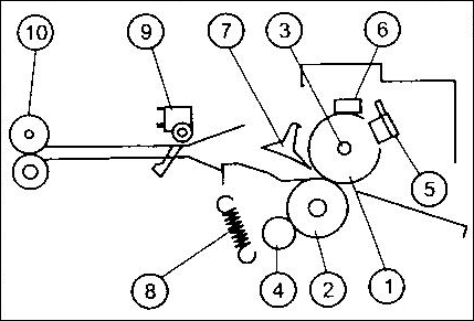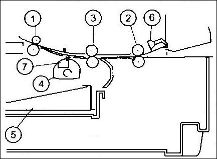Изображение с фотобарабана переносится на бумагу с помощью коротрона переноса 1. Используется барабан диаметром 30 мм. После переноса изображения на бумагу она разряжается разрядной пластиной 2 и отделяется от фотобарабана. Если бумага не отделилась от фотобарабана, она отделяется механически с помощью отделяющего упора. Из блока переноса по транспортировочной ленте 5 бумага подается в блок термозакрепления и вывода.