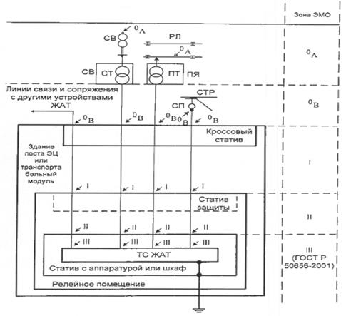 - Расположение элементов систем ЖАТ в зонах с электромагнитной обстановкой (ЭМО) разной степени жесткости предопределяет каскадный принцип построения защиты, при котором каждый каскад должен обеспечивать защиту элементов системы ЖАТ до соответствующего уровня напряжения, допустимого для следующего каскада.