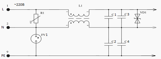 Сигнал со входа поступает на разрядники, затем на варисторы, конденсаторы и дроссель, а также на стабилитроны. После чего сигнал идёт на выход.